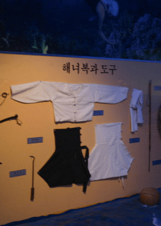Autrefois, les Haenyeo enfilaient de légers vêtements : un simple ensemble de lin blanc (un short, une chemise-camisole pour le haut et un turban sur la tête), accompagné d'un masque, un bitchang (une tige en métal qui leur permet de décrocher les coquillages des rochers), un tewak (un panier qui flotte à la surface de l’eau dans lequel elles mettent leur butin), et quelques poids autour de la taille pour faciliter leur descente.