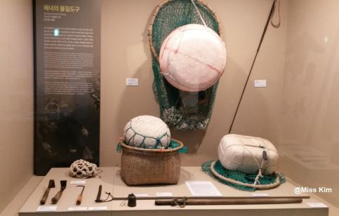 Une combinaison de plongée en néoprène (qui préservent du froid), leur célèbre "lunette" (sorte de masque de plongée), des palmes, une paire de gants, une ceinture lestée pour faciliter la plongée, divers outils pour creuser dans le fond marin (des plongeuses emportent avec elles une pique en forme de L), enfin le dispositif de flottaison (appelé "tewak") est laissé à la surface de l'eau qui est relié à un filet suspendu sous le dispositif, où les Haenyeo stockent leur récolte jusqu'à la fin de la journée.