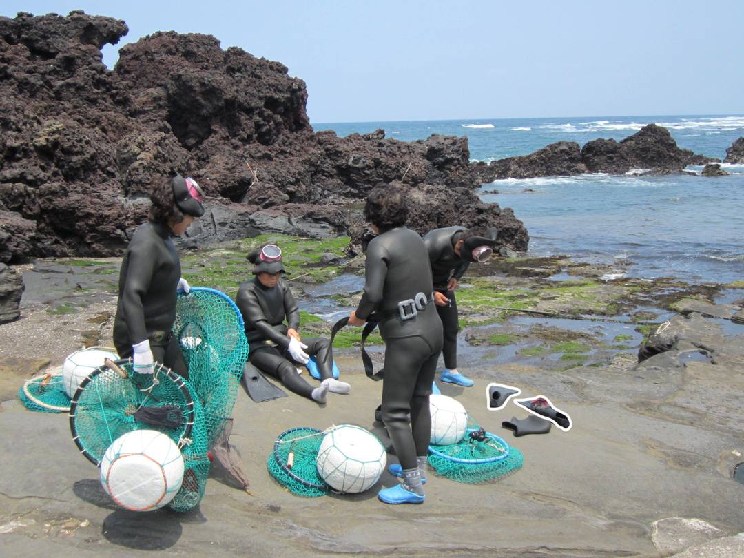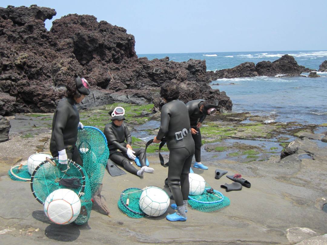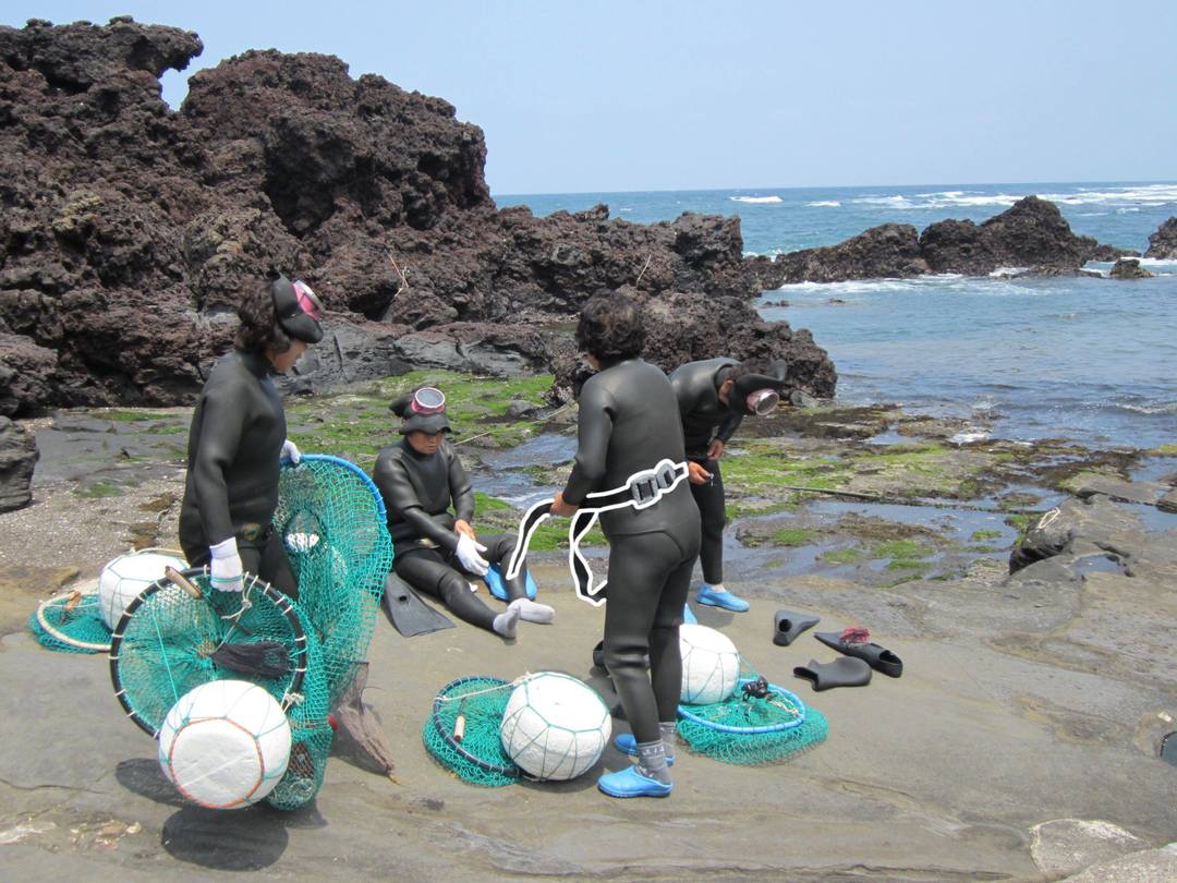 Auparavant, avant l’utilisation de la ceinture, les Haenyeo avaient l’habitude de remplir des sacs de pierre pour la plongée.